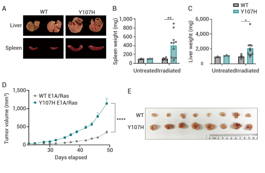 此外,用腺病毒 E1A 和突变 Ras 转化 WT 和 Y107H MEF,将 E1A/Ras MEF 皮下注射到免疫受损小鼠中,并测量肿瘤随时间的生长情况。Y107H E1A/Ras 肿瘤的生长速度明显快于 WT 肿瘤 (图 3D-E)。