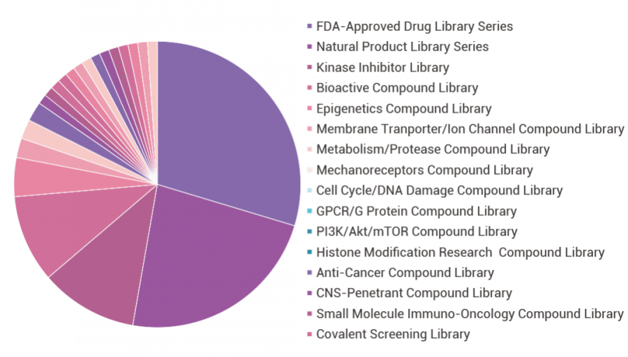 经过统计, 小 M 发现,FDA 上市库 (HY-L022)、天然产物库 (HY-L021)、生物活性化合物库 (HY-L001) 以及激酶抑制剂库 (HY-L009) 是客户购买最多的化合物库。除定制化合物库以外,客户选择购买的化合物库共有 33 种,其中包含了老药新用化合物库系列、信号通路化合物库系列、天然产物化合物库系列以及类药多样性化合物库系列等等。