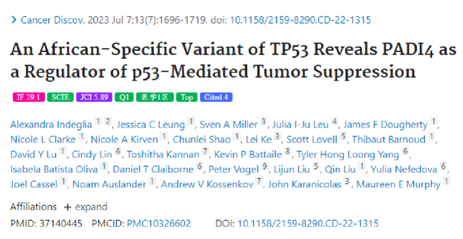 [1] Indeglia A, et al. An African-Specific Variant of T P53 Reveals PADI4 as a Regulator of p53-Mediated Tumor Suppression. Cancer Discov. 2023 Jul 7;13(7):1696-1719. |
