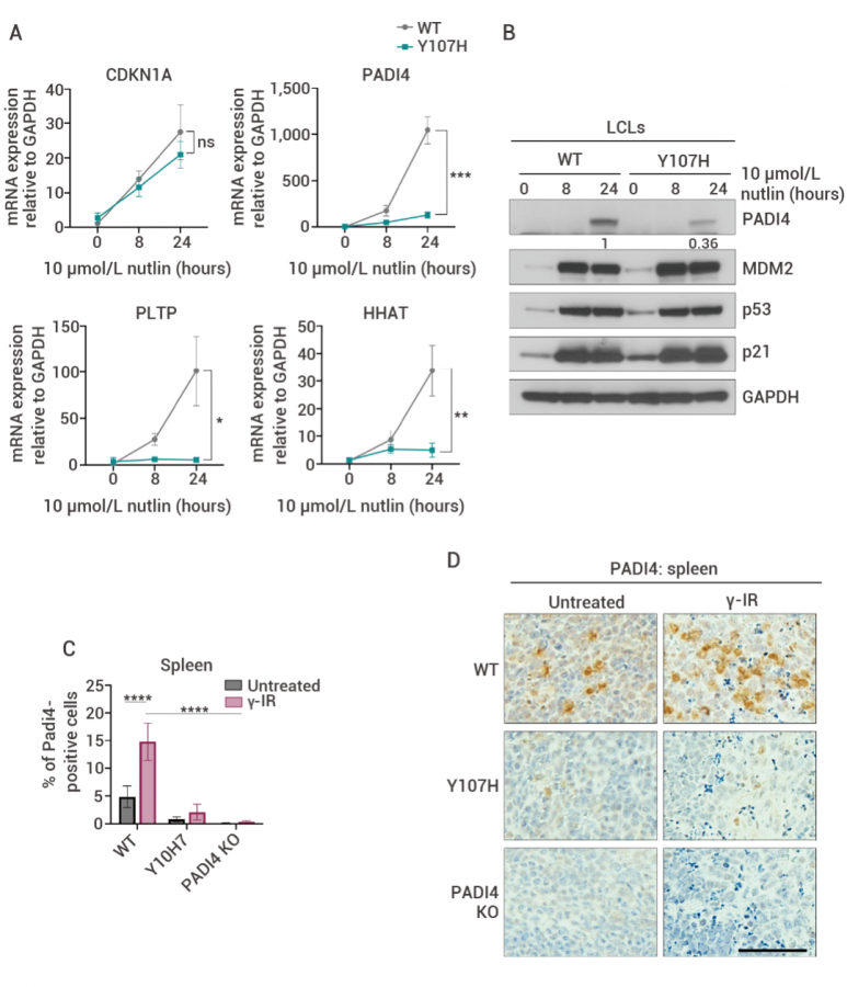 首先作者展开了对 Y107H 的功能研究,发现 Y107H 变体在生长抑制和细胞凋亡方面与 WT p53 相当。例如,Y107H 的集落抑制受到适度损害。Doxorubicin 和 γ 辐射处理导致 Y107H LCL 细胞凋亡有所增加。接下来,用 Nutlin-3a (nutlin) 或 Cisplatin 处理 Y107H 杂合子和 WT p53 的人类 LCL 细胞进行 RNA 测序 (RNA-seq)。该分析揭示了 WT 和 Y107H LCL 中几乎相同的 p53 靶点激活。然而,在独立样本进行 qRT-PCR 分析时,发现 p53 的靶标 PLTP、PADI4 和 HHAT 受到 nutlin 诱导的反式激活明显受损。Western blot 实验表明在蛋白质水平上 Y107H LCLs 在 nutlin 处理后,PADI4 上调受阻。γ 辐射后,Y107H 小鼠脾脏和胸腺中的 PADI4 免疫染色也明显减少 (图 1)。