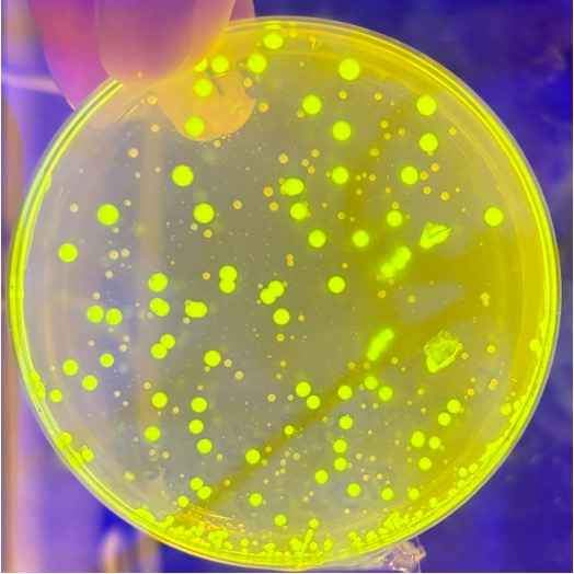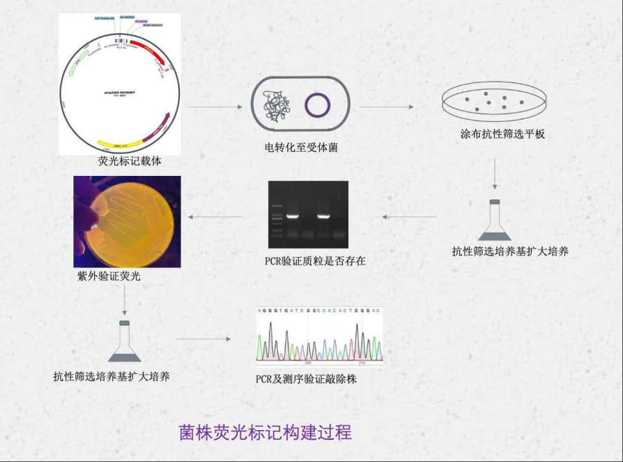 绿色荧光蛋白(green fluorescent protein,GFP)作为一种理想的活体荧光标记分子,越来越多地被用于活细胞或微生物的定位、结构和动力学的研究,也可以通过测定GFP的荧光强度对菌株中GFP的表达量进行定量分析[1]。GFP已经在许多细菌中完成了转化,如:(1)利用GFP追踪了乳酸乳球菌WH-C1在小鼠肠道内的定植情况;(2)利用GFP发现德氏乳杆菌D17嵌入在黏液层中,局部接近肠道的上皮细胞;(3)在植物乳杆菌WCFS1中进行GFP标记,研究WCFS1在肠道内的定植与分布。 红色荧光蛋白 (Red Fluorescent Protein, RFP)相比绿色荧光蛋白 (GFP)其灵敏度更高, 是基于GFP基础上的一种优良稳定的荧光蛋白。目前已在不同的菌株中成功进行RFP标记,如:(1)在根瘤菌中进行RFP荧光标记,可探究根瘤菌结瘤固氮能力及根瘤菌与土著菌竞争关系 [2];(2)构建了以红色荧光蛋白基因 (dsred2) 为标记, 以α-淀粉酶 (amy) 为报告基因的表达载体, 成功实现了融合基因dsred2-amy在干酪乳杆菌中的融合表达;(3)铜绿假单胞菌中转入RFP标记,证实其在含油多孔物质中的迁移扩散及所受限制[3];(4)在幽门26695中构建了GFP和RFP荧光标记,用于探究幽门的遗传调控和信号追踪[4]。 mCherry荧光蛋白也叫樱桃荧光蛋白,是从蘑菇珊瑚(mushroom coral)中分离出来的单体红色荧光蛋白,相较于其它单体荧光蛋白,其颜色和单体分子的光稳定性更强。mCherry荧光标记技术在细胞生物学、分子生物学和神经科学等多个领域都有广泛应用,用于追踪蛋白质、细胞器或其他生物大分子在活细胞中的分布和动态。近年来, mCherry用于荧光标记的研究报道逐渐增多, 相对其他荧光蛋白, 该荧光标记具有标记基因小、背景低等优点, 且与已报道的dsred2红色荧光基因相比, 其荧光强度及稳定性更好。目前已成功在多种菌株中进行标记:如:(1)成功在蒙氏肠球菌ST4SA和植物乳杆菌423中进行mCherry荧光蛋白标记;(2)在植物乳杆菌中进行mCherry荧光蛋白标记,是探究其在生物体内的定位、示踪及益生性作用机制的有效技术手段[5]。 实验流程: 1:构建荧光标记载体; 2:电转至受体菌; 3:涂布抗性筛选平板; 4:抗性筛选培养基扩大培养; 5:PCR验证质粒是否存在; 6:紫外验证荧光; 7:抗性筛选培养基扩大培养 发自小木虫Android客户端 |