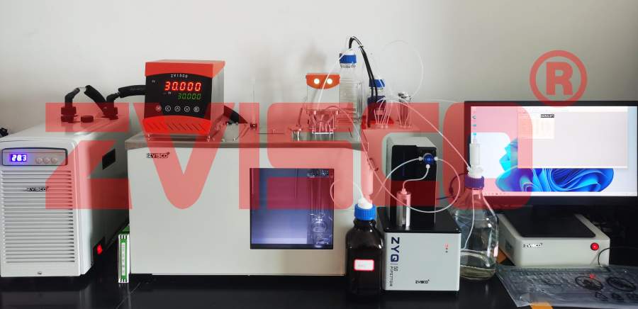 溶剂粘度的测定:卓祥全自动粘度仪设置到实验目标温度值并且稳定后,加入甲苯,软件中启动测试任务待结束。