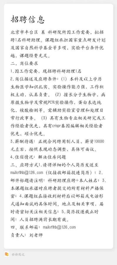 岗位描述及应聘条件:(1)本科及以上学历生物医学知识扎实、实验操作能力强,工作积极主动,认真负责。(2)擅长分子生物学,病原微生物学及常规PCR实验操作,蛋白表达纯化,核酸检测等。需辅助实验室管理和处理日常行政事务。(3)具有生物专业相关研究或工作经验者优先,具有crispr基因编辑相关经验者优先,硕士优先。 3.薪酬待遇:正规合同聘用制人员,薪资10000元左右,按照表现动态调整,具体可面议。 4.住宿情况:解决住房问题 三、应聘方式1.请将详细的个人简历发送至mailoflhb@126.com 发自小木虫Android客户端 |