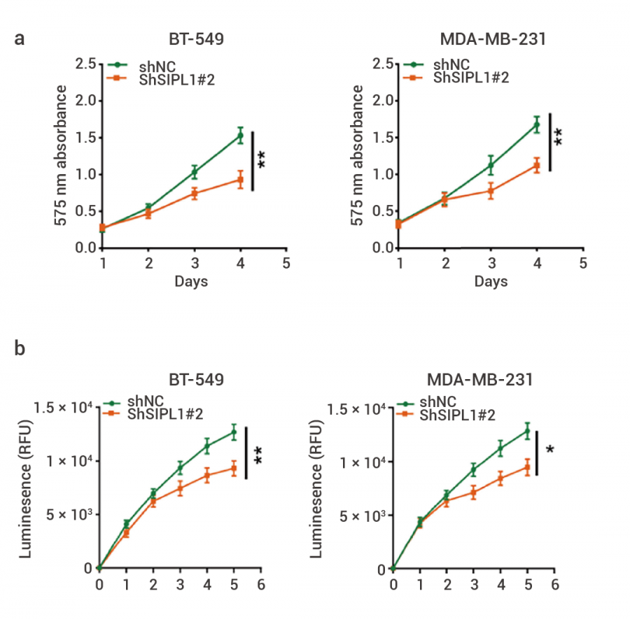图 2. SIPL1 对 TNBC 细胞活力的影响[2]。CCK-8 (a) 和 CTG 发光细胞活力测定 (b) 用指示载体转导 BT-549 和 MDA-MB-231 细胞增殖能力的分析。