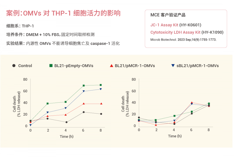 图 3. OMVs 对 THP-1 细胞活力的影响[3]。LDH 检测发现内源性 OMVs 不能诱导细胞焦亡及 Caspase-1 的活化。
