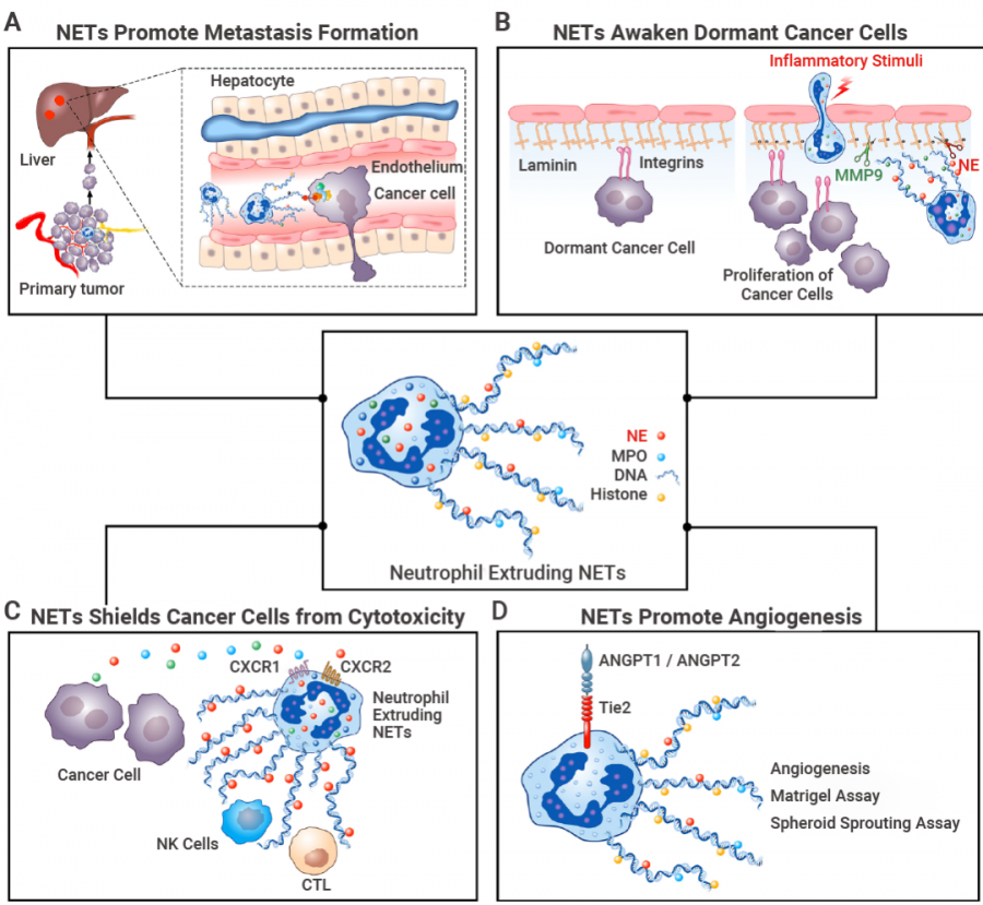 NETs 通过诱导上皮细胞-间充质转化,诱导肿瘤细胞转移 (A),裂解层粘连蛋白,唤醒休眠的肿瘤细胞 (B),形成保护屏障,保护肿瘤细胞远离细胞毒素和免疫反应 (C),促进血管生成,诱导细胞转移的方式 (D),诱导肿瘤细胞增殖和转移。