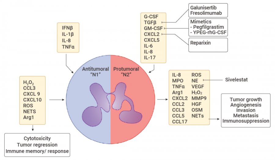 图 1. 中性粒细胞的抗肿瘤 N1 表型和促肿瘤 N2 表型程[2]。