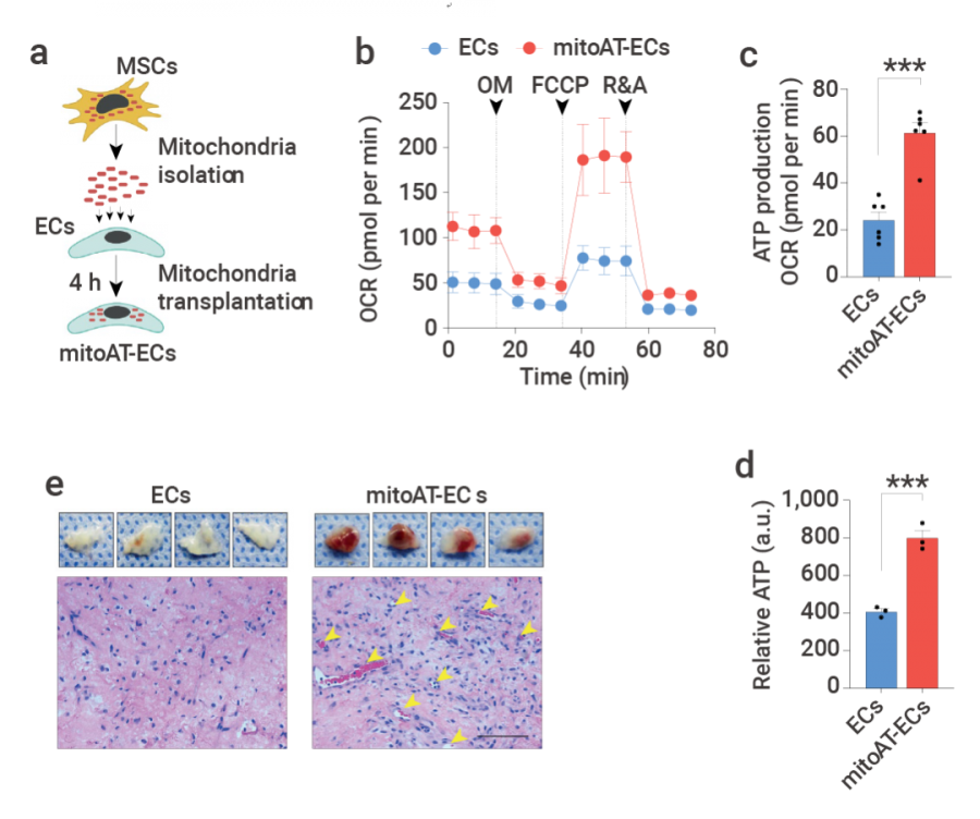 由于当前治疗缺血的方法的局限性,作者想知道用线粒体人工启动内皮细胞是否可以模拟联合移植的效果。为此,作者将从基质细胞中分离出来的线粒体与 ecs 一起孵育,这样线粒体就可以通过一种称为内吞作用的过程被吸收,实现线粒体的人工移植 (称为 mitoat-ec) (图 4a)。