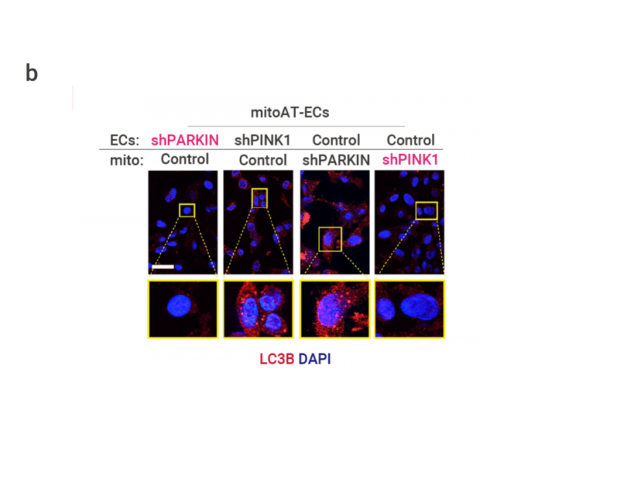 作者在内皮细胞的自噬体中观察到人工移植的线粒体,但是当他们通过沉默编码 pink1 或 parkin 的基因表达来破坏线粒体自噬时,这阻止了线粒体被这些囊泡吞没,即在受体内皮细胞中沉默 parkin (由 prkn 编码) 可以消除 mitoat-ec 中lc3b+ 自噬体的形成 (图 5a-b)。