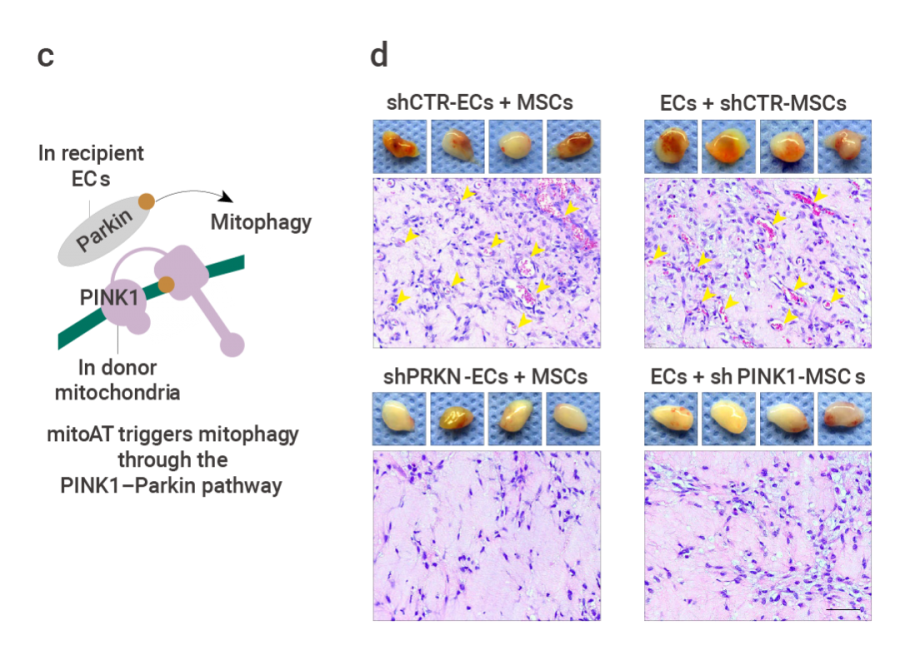 (a) 免疫荧光显示移植 24 h 后 mitoat-ec 中外源性 dsred+ 线粒体 (红色 )与内源性 parkin (alexa 647) 共定位 (白色箭头)。(b) mitoat-ec 中 lc3b+ 自噬体的免疫荧光检测。parkin 和 pink1 沉默 (shrna) 对供体 msc 线粒体 (mito) 或受体 ec 的影响,dapi 为细胞核。(c) 沉默 pink1 和 prkn 对间充质干细胞共植内皮细胞植入能力的影响: 第7天血管灌注移植物 (箭头) 的观察和 h&e 染色。(d) 图中显示 parkin (受体 ecs) 和 pink1(供体线粒体)在 mitoat-ecs 中自噬激活中的作用。