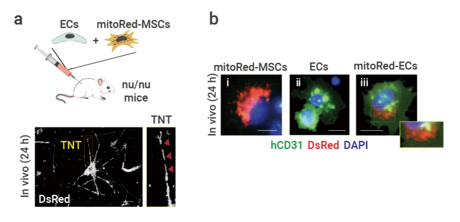 (a) 注射 ecs 和 mitored-mscs 的小鼠示意图,下图为带有 dsred+ 的 tnts。(b) 免疫荧光技术鉴定带有 dsred+ 线粒体的 ecs (mitored-ecs)。