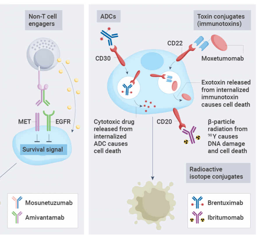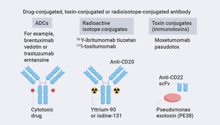 第三种主要形式涉及与有毒有效载荷相关的抗体,例如细胞毒性药物 (抗体-药物偶联物, ADC)、细菌或植物毒素 (免疫毒素) 或放射性同位素,它们增强了抗体杀死癌细胞的能力。ADC 是迄今为止使用最广泛的形式,而毒素偶联抗体和放射性同位素偶联抗体尚未得到广泛采用。