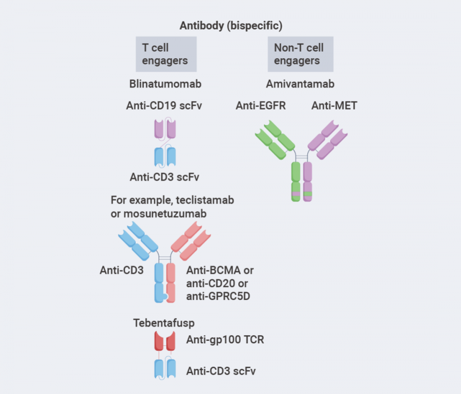 与单特异性抗体不同,双特异性抗体结合两种不同的抗原或表位,抗原可以定位于同一靶细胞或不同细胞上。靶向两种不同细胞的双特异性抗体大多是 T 细胞接合器,将癌细胞与效应 T 细胞交联。因此,它们被命名为 T 细胞接合器 (TCE) 双特异性抗体。交联后,效应 T 细胞被激活,通过释放细胞毒性颗粒和淋巴因子来杀死结合的靶癌细胞。另一类双特异性抗体与同一靶细胞表达的不同抗原结合,例如两种不同的生长因子受体。这种双特异性抗体通过阻断通过靶生长因子受体的增殖信号,并通过激活 NK 细胞和巨噬细胞对抗癌细胞来杀死靶细胞。