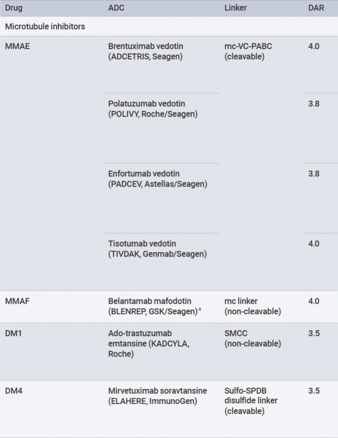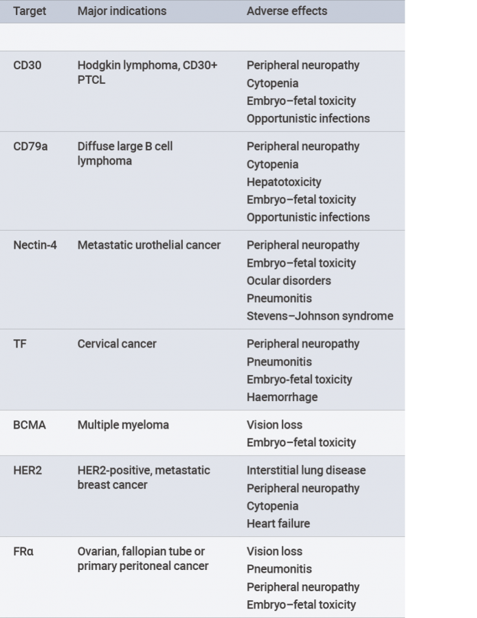 表 2. FDA 和 EMA 批准或即将批准的抗体—药物偶联物 (部分)[1]。