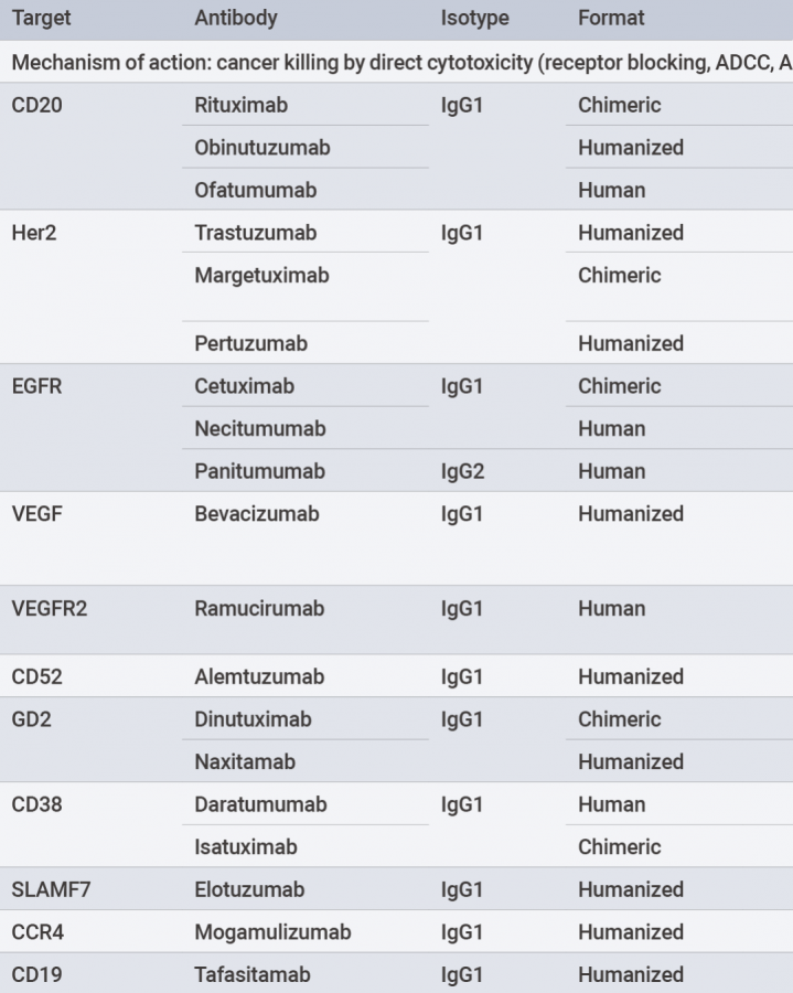 最早获得 FDA 批准的抗体是靶向 CD20 的 Rituximab 和靶向 HER2 的Trastuzumab,这两种抗体都使用共同的 IgG1 同种型。IgG1 诱导 ADCC 和 ADCP 最终导致癌细胞死亡,并且可以通过 Fc 工程进一步增强毒性作用,FcγR 对利妥昔单抗表现出更高的反应。IgG1 亚类还能够结合补体蛋白 C1q,导致补体依赖性细胞毒性 (CDC),致癌细胞死亡。