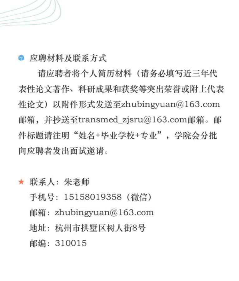 实验室概况: 转化医学研究院是浙江树人学院为推动学科建设和创新研究,服务地方和产业重大需求而设置的重点研究机构。研究院以免疫和抗衰老为核心研究方向,以“一体两翼四平台”为建设思路,构建抗衰老与代谢干预、免疫功能分析和调控、生物材料和细胞工程、模式动物和微生物组学等研究方向和平台, 推动建设以中青年人才为核心的创新研究队伍。 实验室位于浙江省杭州市拱墅区树人街8号,隶属于浙江树人学院,地处杭州美丽的西子湖畔,比邻杭州拱宸桥,区位优势明显,交通便利。 为加快推进重点方向的研究工作,积极推进研究院建设,现面向国内外公开招聘医学、生物学、药学、材料学、信息学、化学或交叉学科等相关学科领域优秀人才加盟转化医学研究院,共创美好未来。 发自小木虫Android客户端 |