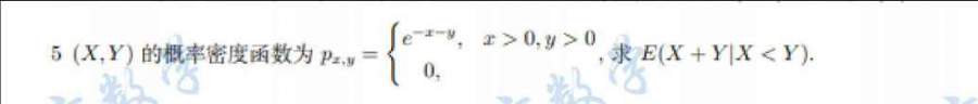 要解决这个问题,我们首先需要明确题目所给的概率密度函数,并计算条件期望 \(\mathbb{E}(X + Y \mid X < Y)\)。 题目给出的联合概率密度函数为: \[ p_{X,Y}(x,y) = \begin{cases} e^{-x-y} & \text{if } x > 0, y > 0 \\ 0 & \text{otherwise} \end{cases} \] 我们需要计算的条件期望是 \(\mathbb{E}(X + Y \mid X < Y)\)。 首先,确定条件概率密度函数 \( p_{X,Y \mid X < Y}(x,y) \)。 \[ p_{X,Y \mid X < Y}(x,y) = \frac{p_{X,Y}(x,y) \cdot I(x < y)}{\mathbb{P}(X < Y)} \] 其中 \( I(x < y) \) 是指示函数,表示 \( x < y \) 时为1,否则为0。 计算 \( \mathbb{P}(X < Y) \): \[ \mathbb{P}(X < Y) = \int_{0}^{\infty} \int_{0}^{y} e^{-x-y} \, dx \, dy \] 首先计算内积分: \[ \int_{0}^{y} e^{-x-y} \, dx = e^{-y} \int_{0}^{y} e^{-x} \, dx = e^{-y} \left[ -e^{-x} \right]_{0}^{y} = e^{-y} \left( 1 - e^{-y} \right) \] 然后计算外积分: \[ \mathbb{P}(X < Y) = \int_{0}^{\infty} e^{-y} \left( 1 - e^{-y} \right) \, dy \] 将 \( 1 - e^{-y} \) 分成两个积分: \[ \mathbb{P}(X < Y) = \int_{0}^{\infty} e^{-y} \, dy - \int_{0}^{\infty} e^{-2y} \, dy \] 这两个积分都是标准的指数积分: \[ \int_{0}^{\infty} e^{-y} \, dy = 1 \] \[ \int_{0}^{\infty} e^{-2y} \, dy = \frac{1}{2} \] 所以: \[ \mathbb{P}(X < Y) = 1 - \frac{1}{2} = \frac{1}{2} \] 因此条件概率密度函数为: \[ p_{X,Y \mid X < Y}(x,y) = 2 e^{-x-y} \cdot I(x < y) \] 接下来我们计算条件期望: \[ \mathbb{E}(X + Y \mid X < Y) = \int_{0}^{\infty} \int_{0}^{y} (x + y) \cdot 2 e^{-x-y} \, dx \, dy \] 将期望分成两个积分: \[ \mathbb{E}(X + Y \mid X < Y) = 2 \left( \int_{0}^{\infty} \int_{0}^{y} x e^{-x-y} \, dx \, dy + \int_{0}^{\infty} \int_{0}^{y} y e^{-x-y} \, dx \, dy \right) \] 首先计算第一个积分: \[ \int_{0}^{\infty} \int_{0}^{y} x e^{-x-y} \, dx \, dy \] 计算内积分: \[ \int_{0}^{y} x e^{-x} e^{-y} \, dx = e^{-y} \int_{0}^{y} x e^{-x} \, dx \] 使用分部积分法: \[ \int x e^{-x} \, dx = -x e^{-x} + \int e^{-x} \, dx = -x e^{-x} - e^{-x} = -e^{-x}(x + 1) \] 带入积分范围: \[ \int_{0}^{y} x e^{-x} \, dx = -e^{-x}(x + 1) \Bigg|_{0}^{y} = -e^{-y}(y + 1) + 1 \] 所以: \[ \int_{0}^{y} x e^{-x} \, dx = 1 - e^{-y}(y + 1) \] 外积分: \[ \int_{0}^{\infty} e^{-y} (1 - e^{-y}(y + 1)) \, dy \] 分开计算: \[ \int_{0}^{\infty} e^{-y} \, dy - \int_{0}^{\infty} e^{-2y}(y + 1) \, dy \] \[ = 1 - \left( \int_{0}^{\infty} y e^{-2y} \, dy + \int_{0}^{\infty} e^{-2y} \, dy \right) \] 第二个积分我们已经计算过了,为 \(\frac{1}{2}\),所以计算第一个积分: \[ \int_{0}^{\infty} y e^{-2y} \, dy = \frac{1}{4} \] 总的结果是: \[ \int_{0}^{\infty} y e^{-2y} \, dy + \int_{0}^{\infty} e^{-2y} \, dy = \frac{1}{4} + \frac{1}{2} = \frac{3}{4} \] 所以: \[ \int_{0}^{\infty} e^{-y} (1 - e^{-y}(y + 1)) \, dy = 1 - \frac{3}{4} = \frac{1}{4} \] 然后计算第二个积分: \[ \int_{0}^{\infty} \int_{0}^{y} y e^{-x-y} \, dx \, dy = \int_{0}^{\infty} y e^{-y} \left( \int_{0}^{y} e^{-x} \, dx \right) \, dy \] \[ = \int_{0}^{\infty} y e^{-y} \left( 1 - e^{-y} \right) \, dy \] 同样分开计算: \[ \int_{0}^{\infty} y e^{-y} \, dy - \int_{0}^{\infty} y e^{-2y} \, dy \] 第一个积分 \(\int_{0}^{\infty} y e^{-y} \, dy = 1\),第二个积分我们已经计算过了,为 \(\frac{1}{4}\),所以总的结果是: \[ \int_{0}^{\infty} y e^{-y} (1 - e^{-y}) \, dy = 1 - \frac{1}{4} = \frac{3}{4} \] 所以: \[ \mathbb{E}(X + Y \mid X < Y) = 2 \left( \frac{1}{4} + \frac{3}{4} \right) = 2 \] 答案是: \[ \mathbb{E}(X + Y \mid X < Y) = 2 \] |