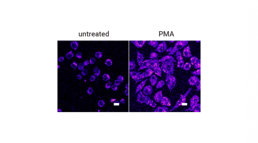 图 4. 利用 HKPerox 探针在活细胞中进行内源性 H2O2 的分子成像[6]。RAW264.7 巨噬细胞与 HKPerox-1 (10 mm) 和 CCl3CN 共培养的代表性共聚焦图像。