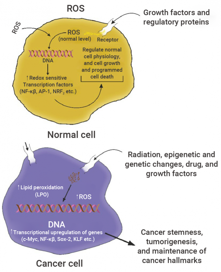 图 2. 正常细胞和癌细胞中 ROS 信号传导的概述[4]。