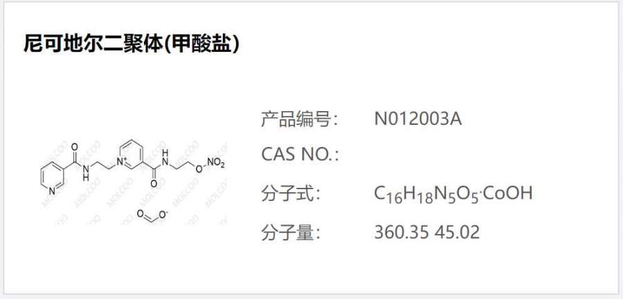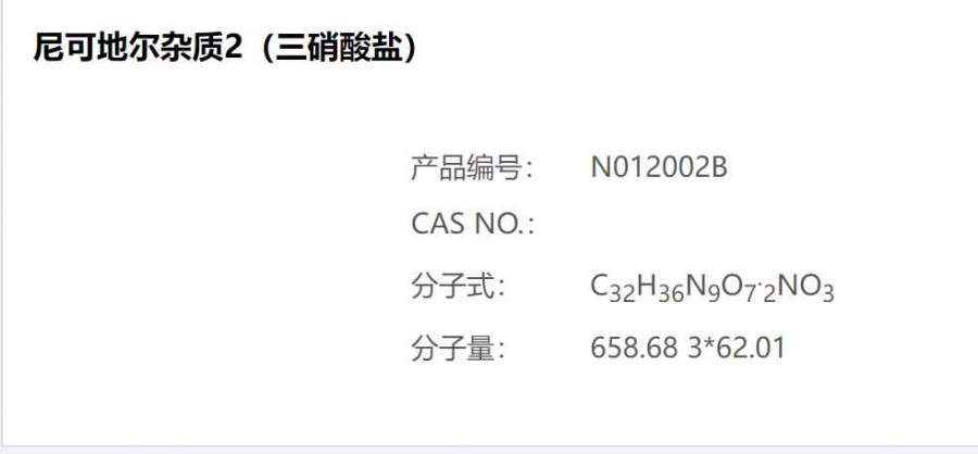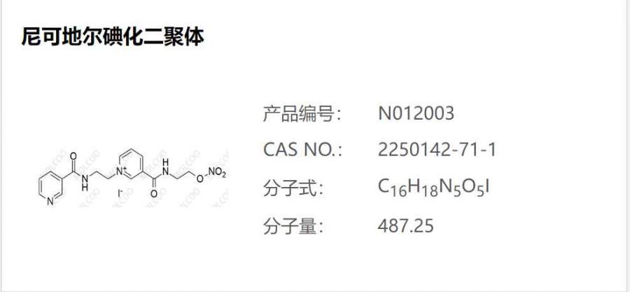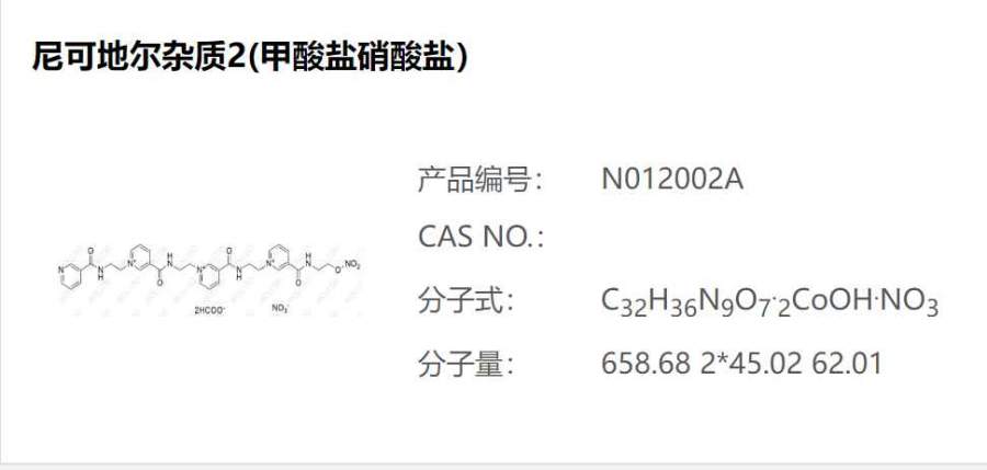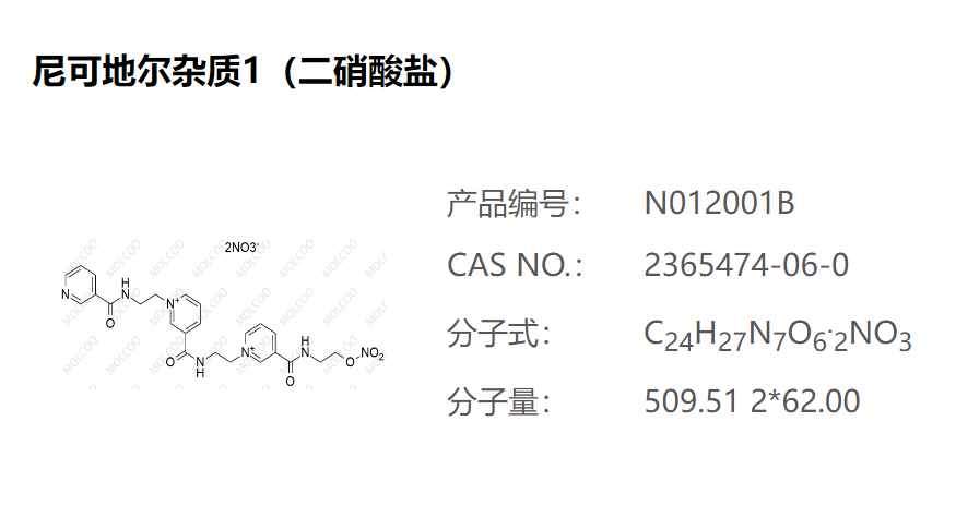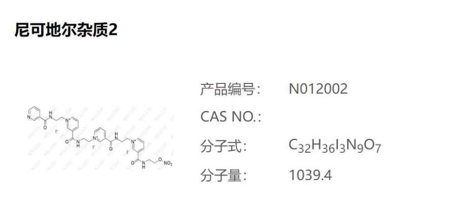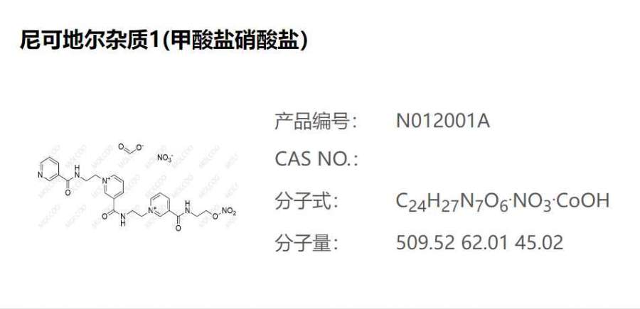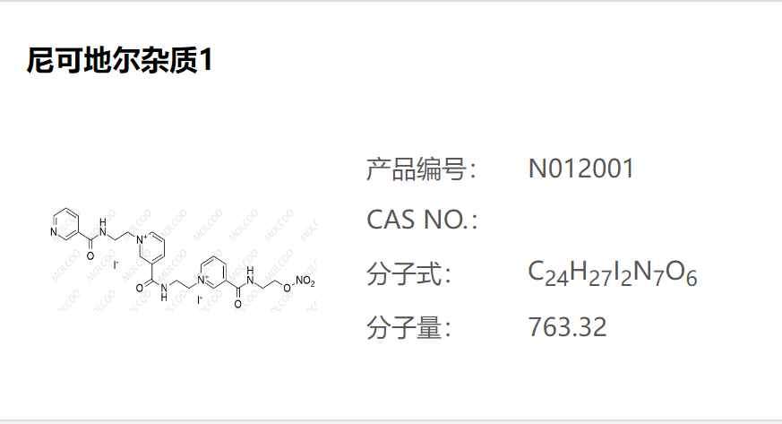 尼可地尔 CAS NO.: 65141-46-0 尼可地尔杂质1 尼可地尔杂质1(甲酸盐硝酸盐) 尼可地尔杂质1(二硝酸盐) CAS NO.: 2365474-06-0 尼可地尔杂质2 尼可地尔杂质2(甲酸盐硝酸盐) 尼可地尔杂质2(三硝酸盐) 尼可地尔碘化二聚体2250142-71-1 尼可地尔二聚体(甲酸盐) 发自小木虫Android客户端 |
