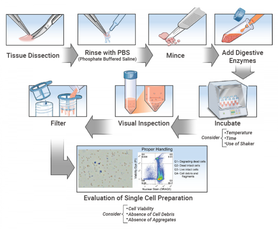 图 1. 从固体组织制备单细胞悬浮液的关键步骤[3]。