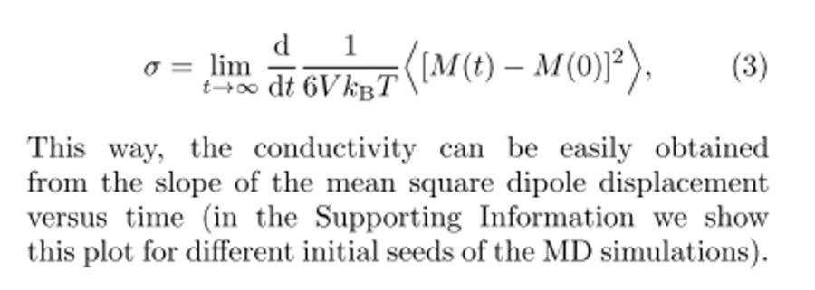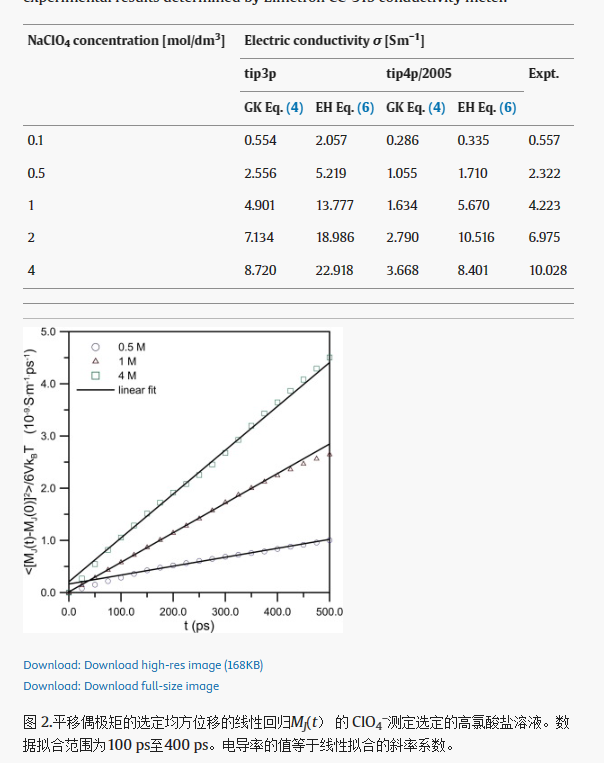 根据上面的这个公式,我使用gromacs中的gmx current 输出了dsp文件。里面包含了公式中dy/dt中的y函数,文件给出了y的单位是s/(ms·ps),按照文献上说的,只需要拟合数据,斜率就是电导率. 我查到了和我比较类型的一篇文献,和我使用相同量级和相同方法。 这是他的数据: 我把文献上的图片导入到origin里面进行拟合,结果拟合出来是1.78686e-12,但是文献上0.5m拟合出来表中是1.710. 我的疑问是:是不是从s·m-1·ps-1求导再求极限得到s/m有量级上的变化,而我没有乘呢? 我试着推导这一过程单位的变化,但是没有正确求出来。@smutao@oxox6085 |