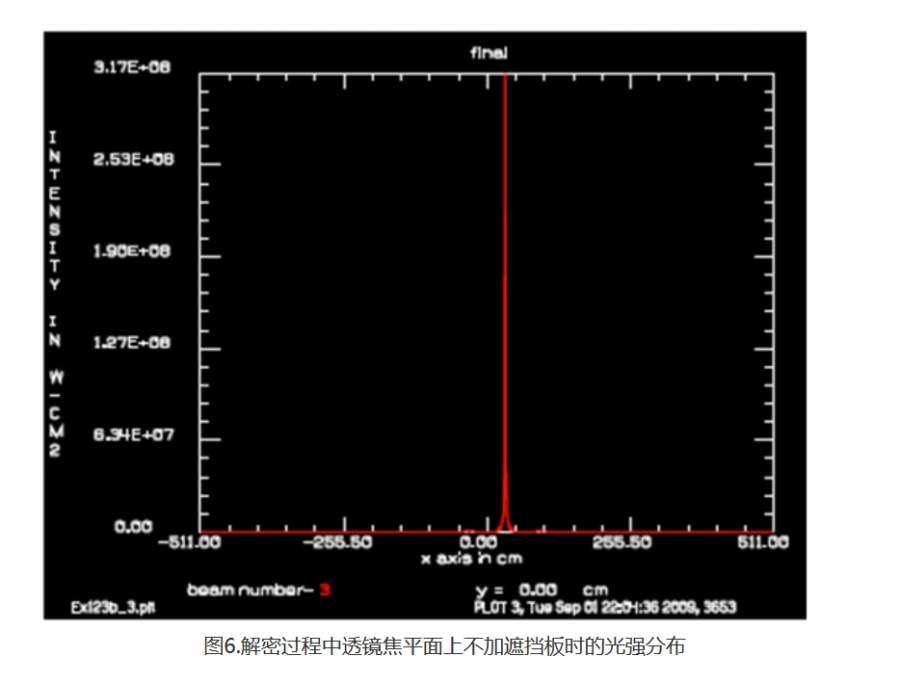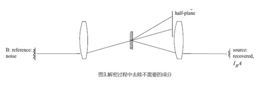 图1是加密过程示意图,在远场区两束光相干涉得到干涉图样,对于一个复杂的随机参考光源,任意选择一个物光源全息图样都会非常的复杂。仅仅依靠全息图是很难确定物光源的,只有使用同一个随机光源才能对其恢复,图2给出了解密过程示意图。通过遮挡板将恢复出的部分分量遮挡就可以滤除不必要的成分,如图3所示。