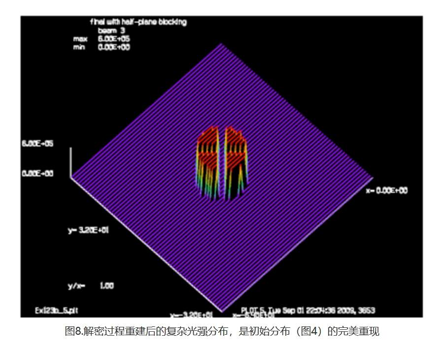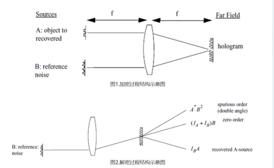 全息图能够通过两束相干光相干叠加获得。用其中一束光照射生成的全息图就可以得到另一束相干光,这样全息图就可以用作加密/解密的装置了。