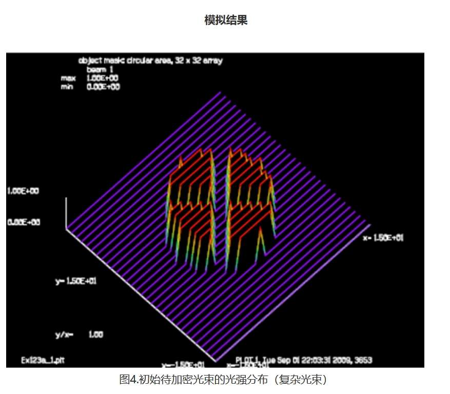 在本例中一个复杂的随机图样作为参考光源,用来恢复全息图样对应的物光源。加密过程中,让两束光干涉叠加得到干涉图样,并用胶片或者光刻胶记录下来,得到一个全息图;解密时,只使用复杂的随机图样照射前面形成的全息图就可以获得物光源信息。