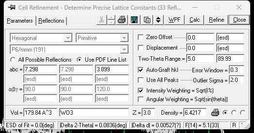 合成方法如下 将4.0 g na 2 wo 4溶解在50 ml去离子水中。在磁力搅拌下加入10 ml 3 mol/l硝酸溶液,得到黄色混悬液。然后,加入5.0 g na 2so 4和20 ml 0.3 mmol草酸溶液。获得透明溶液。磁力搅拌10分钟后,将溶液转移到聚四氟乙烯衬里的高压釜中。将其置于微波水热平行合成器中并加热至150 °c持续2小时。 就是感觉角度对得上,但是峰强度和pdf卡片有点不一样,然后图二是用jade计算了棱边长度和角度,属于六方晶体,就想问一下还要继续摸实验条件吗? 发自小木虫Android客户端 |