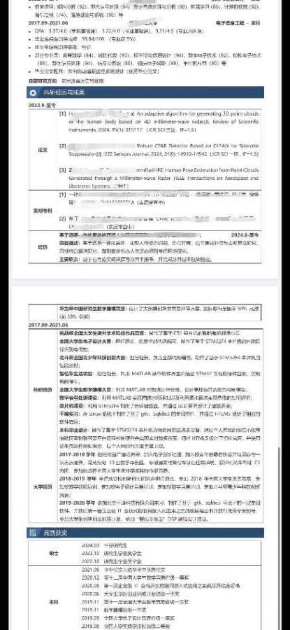 各位老师大家好!本人读博意愿强烈,希望找一名雷达信号处理相关的博士导师。 专业:信息与通信工程专业 研究方向:雷达信号处理 目前已有的成果:两篇SCI(一篇SCI1区、一篇SCI3区),一篇SCI目前已二审。 发明专利两项,均在实质审查中。 联系方式:905762444@qq.com; zjchen1027@Outlook.com 本硕双非,有较好的实践能力,编程能力自我感觉还可以,基础较为扎实。本科硬件涉及较多,也参加了很多比赛,对软硬结合也和感兴趣。 各位老师,同学们可以给我推荐些雷达领域的老师或者学校嘛? 如果您对我感兴趣,欢迎您留下您的邮箱和相关信息,或者发邮件给我,我将发送给您我的简历。 简历部分如下图所示: 谢谢大家! 发自小木虫Android客户端 |