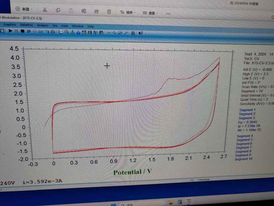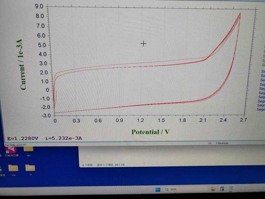大佬们,我用溶于乙腈的TEATFB作双电极电容器的电解液,极片隔膜什么的都用120℃真空干燥了12h,电池壳也用乙醇超声完干燥了,结果CV图在2.1V之后曲线就开始上升,形成一个峰。这个电解液应该能跑到2.7V的,有大佬知道是什么问题嘛 发自小木虫Android客户端 |