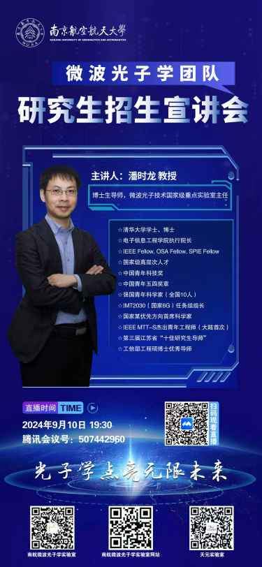 欢迎电子信息类及相近专业的各位同学加入南京航空航天大学微波光子学团队! 微波光子学团队,研究生招生宣讲会 主讲人:潘时龙 教授 时间:2024年9月10日 19:30 腾讯会议号:507442960 |
