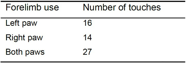 一,将小鼠放在直径为20cm、高度为40cm的透明树脂玻璃圆筒内,观察其自发站立探究活动5min并录制视频。然后分析视频,以评估鼠的左右前肢在其探索活动中的偏爱性。为了更加精确地统计小鼠左右前肢碰壁时间,分析视频时,视频的速度放慢为真实速度的1/5。分别统计每只鼠左前肢、右前肢以及两前肢同时趴在圆筒壁上的时间,计算自发探究活动中每只脚趴在壁上的时间占总时间的比例,不对称指数为:同侧前肢单独趴壁百分率-对照侧前肢单独趴壁百分率。