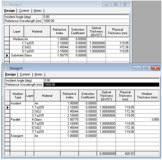 图2.原始设计文档(上部)通过勾选Display Setup对话框中的Medium条目添加了Medium Type和Medium Thickness列。然后将3毫米厚平行基板与背面膜层一起添加,最后将出射介质设置为空气。