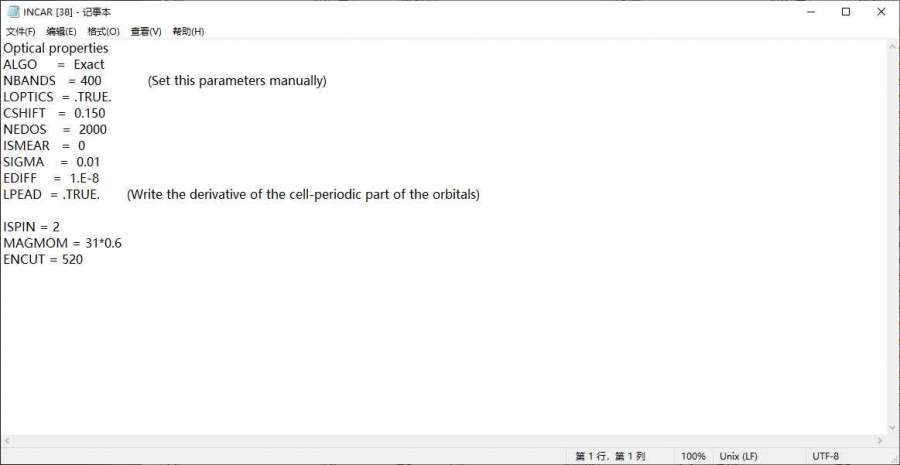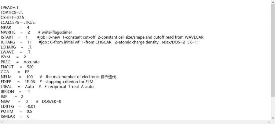 Vasp小萌新,想请问一下各位大佬,就是我在计算光学性质的时候,输出的outcar里面没有我想要的内容,比如我grep dielectric outcar出来的是dielectric tensor =T 或者F啥的,因为在路上发的帖子,所以忘记了。我根据vaspkit提供的INCAR修改后发现可以执行了。就是到现在还没结果,我想问下各位大佬我到底是哪里有问题,附修改前后INCAR 发自小木虫Android客户端 |