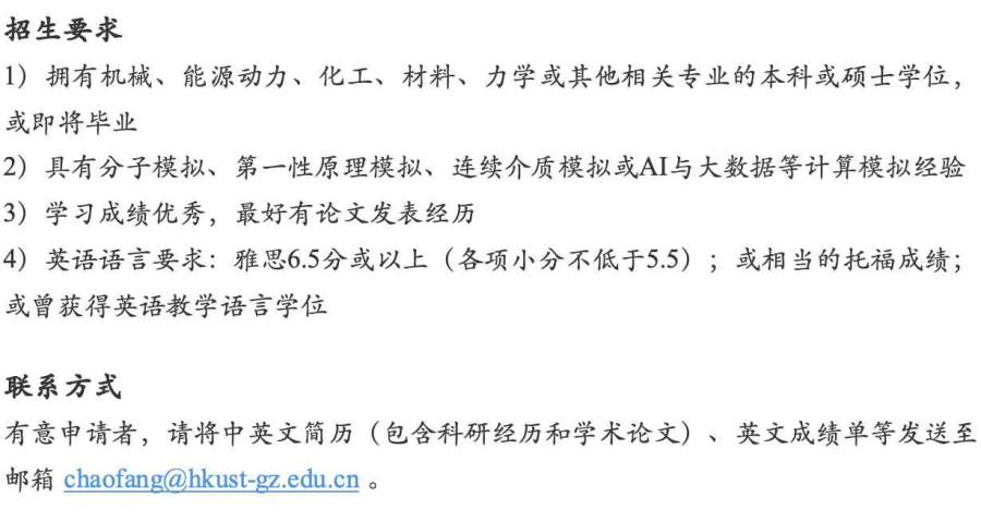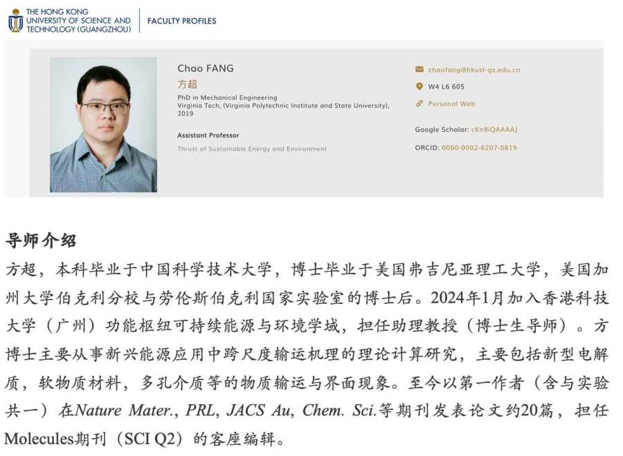 香港科技大学(广州)方超课题组招聘全奖博士(能源应用理论计算方向)