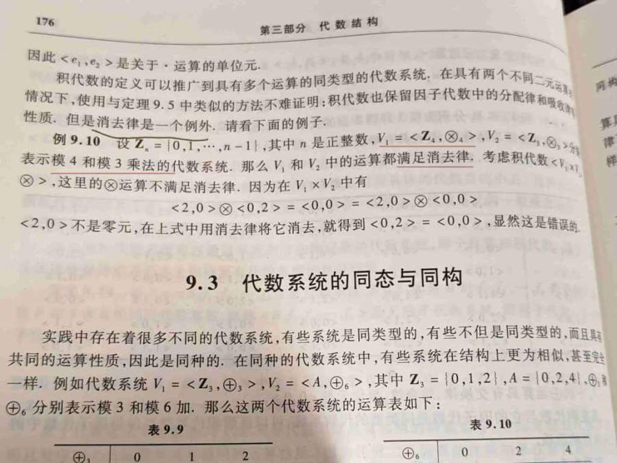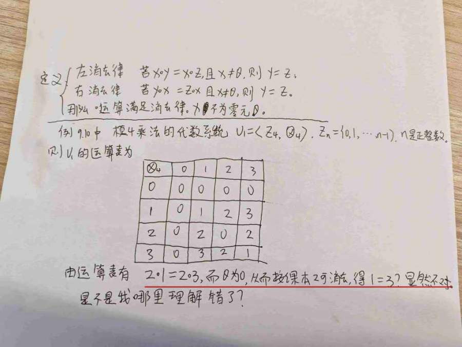 我看离散数学的课本上讲是满足的,如截图1; 但是实际列出运算表,发现2与1的运算结果等于2与3的运算结果,又2不为0元,消去2后,1显然是不等于3的,如截图2; 我找了b站的视频,看到老师讲这个的时候举的例子是模3乘和模2乘;不是书上的模4乘和模3乘。所以是不是书上这里的例子错了? 发自小木虫Android客户端 |