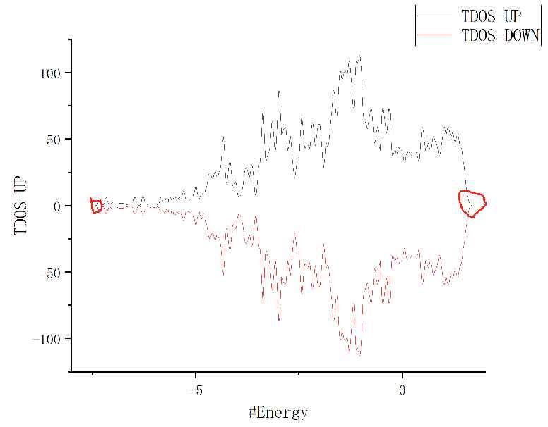 | vaspkit得到的DOS的dat文件,放在origin中,自旋向上出现负值、自旋向下出现正值 |