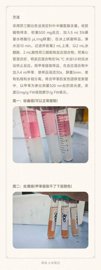 做标曲时可以提取红色到上层溶液,但是5ml 3%磺基水杨酸研磨针叶后,沸水浴10 min 再过滤后的溶液酸性茚三酮水浴处理后虽然变红,但是甲苯提取不了。 @lonerice @ly197408 发自小木虫Android客户端 |