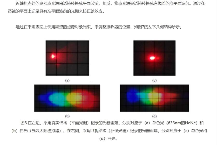 光栅-透镜光谱分离结构由位于平凸透镜的入口孔径处的平面透射光栅组成。入射光谱的一部分离轴(在15-30°)衍射到透镜中。未被全息衍射的光在轴上进入透镜,并在近轴焦点处会聚。衍射光谱分量进入透镜离轴并且分散在这样一个表面(对应透镜的场曲和全息图的色散特性的表面上)[4]。