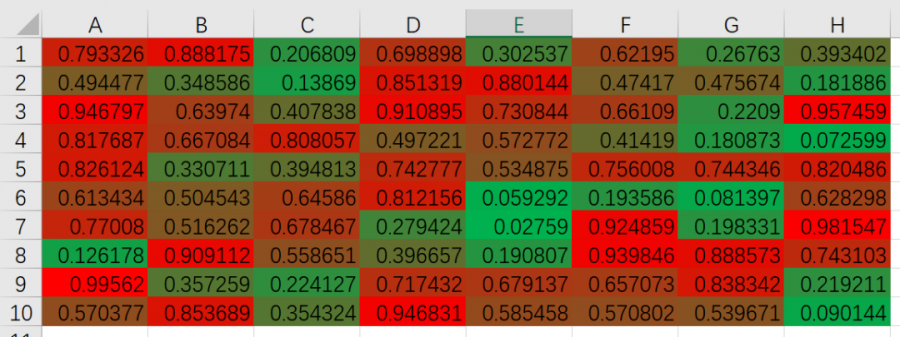 黑人问号脸?三秒钟我一行数据都看不完!但是如果看下面这张图,告诉你红色代表数字较大,原谅色代表数字较小:
