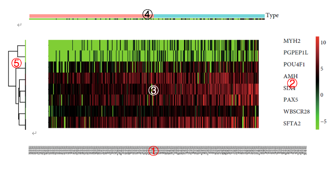 ②是它的纵坐标,代表基因,此外还表示红色代表高表达,绿色代表低表达;