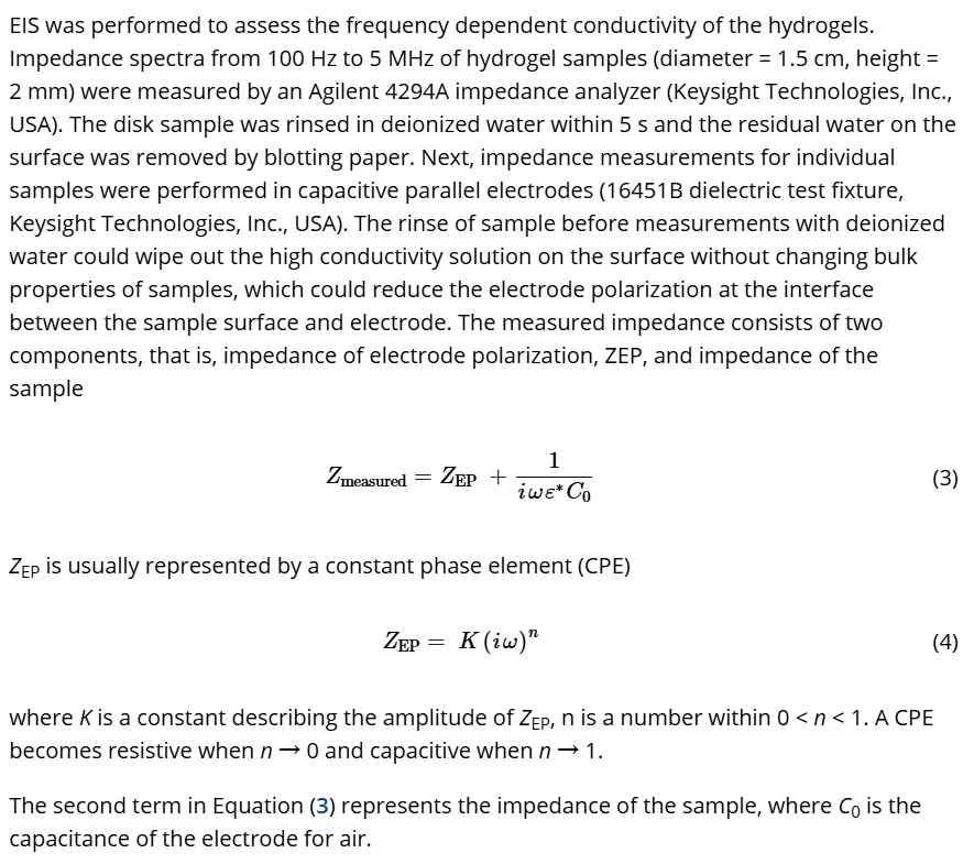 之前看过一篇文献里面放了一张交流电导率随频率变化的曲线图(图片和方法如下),看完方法后仍然很困惑,就想知道这种不同频率下的电导率是如何计算的(如果直接把阻抗的模|Z|带入公式σ=L/(R·S)后像σ=L/(|Z|·S)这样计算可以吗)