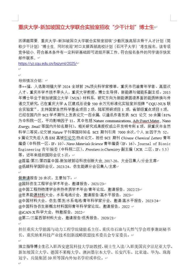 重庆大学-NUS联合实验室招收“少干JIHUA”博士生