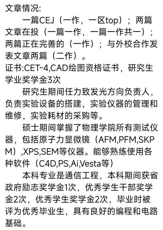 老师您好,本科光电,硕士光学工程,学过基础物理,量子力学,量子光学,信息光学,高等光学,激光原理,半导体物理等,重庆人,成果有一篇一区一作Photonics Research 两个发明专利公示期(第一发明人),一个实用新型专利公示期(第一发明人) 发自小木虫手机客户端 |