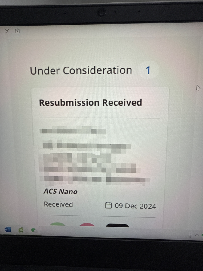 本人是第一作者,前段时间投了ACS Nano,编辑给了拒稿重投,一个月之前重新投出了,但是我老板投的,我看不到状态,投稿两天后收到了分配副编辑邮件,后来在ACS Publishing Center 网站上查到的信息是Under Consideration,也没有in peer review,请问各位大神们这是什么意思,送审了吗?