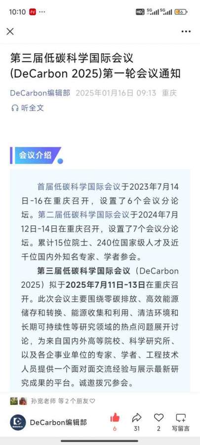 第三届低碳科学国际会议(DeCarbon 2025)拟于2025年7月11日-13日在重庆召开。