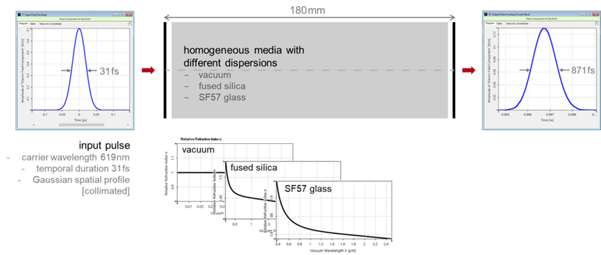 在现代光学系统中,超快现象经常被应用于各种各样的场合。由于这种短脉冲的光谱带宽很大,色散效应在这些系统的设计和分析中起着重要作用。因此,为了确保准确和合适的建模,系统中的所有色散效应都必须得到充分考虑。为了强调快速物理光学软件VirtualLab Fusion在这个特定光学领域的能力,我们展示了两个例子。在第一个例子中,我们研究了一个脉冲在不同材料中传播时的行为,并说明了相应的色散相关效应。我们还用这个例子来展示VirtualLab Fusion的脉冲评估检测器的能力。在第二个例子中,我们研究了在电介质或金属涂层镜面上的反射所产生的色散效应。