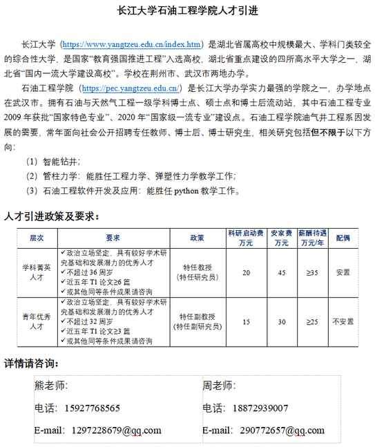 长江大学石油工程学院油气井工程系因发展需要,急需引进一批人才,欢迎大家加入或推荐,待遇及联系方式如下: 谢谢! 发自小木虫手机客户端 |